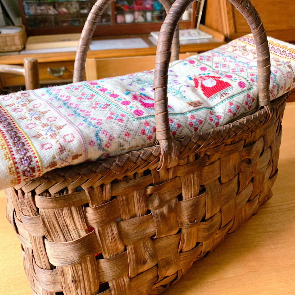 完成した「LIFE」を、母から譲り受けた山葡萄のかごバッグに乗せてみました。
