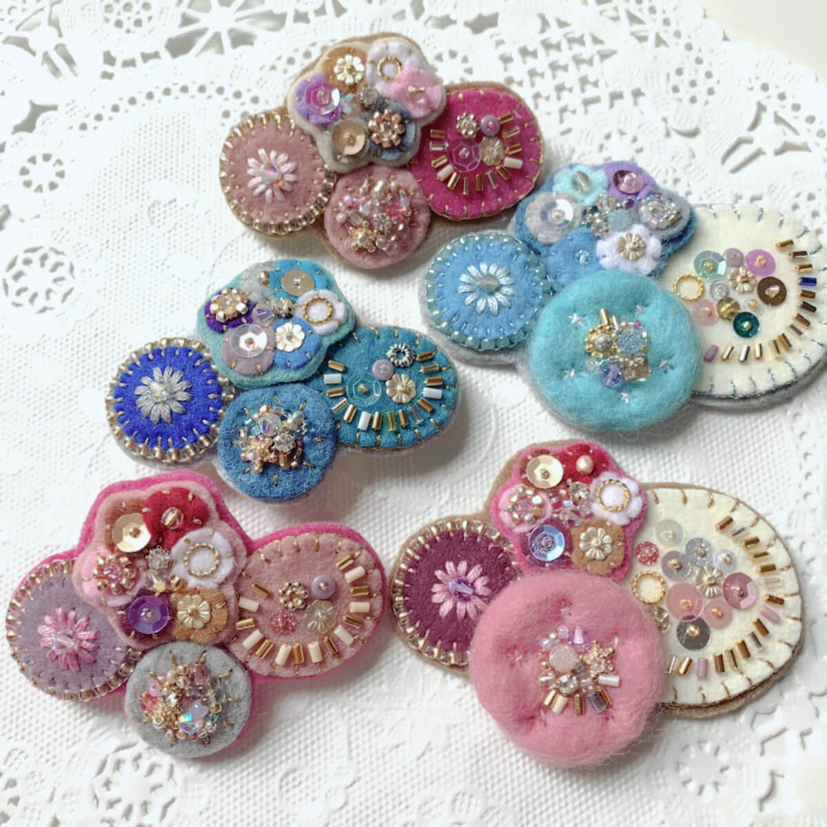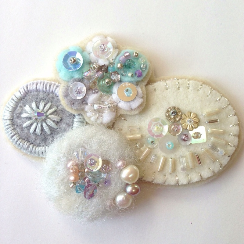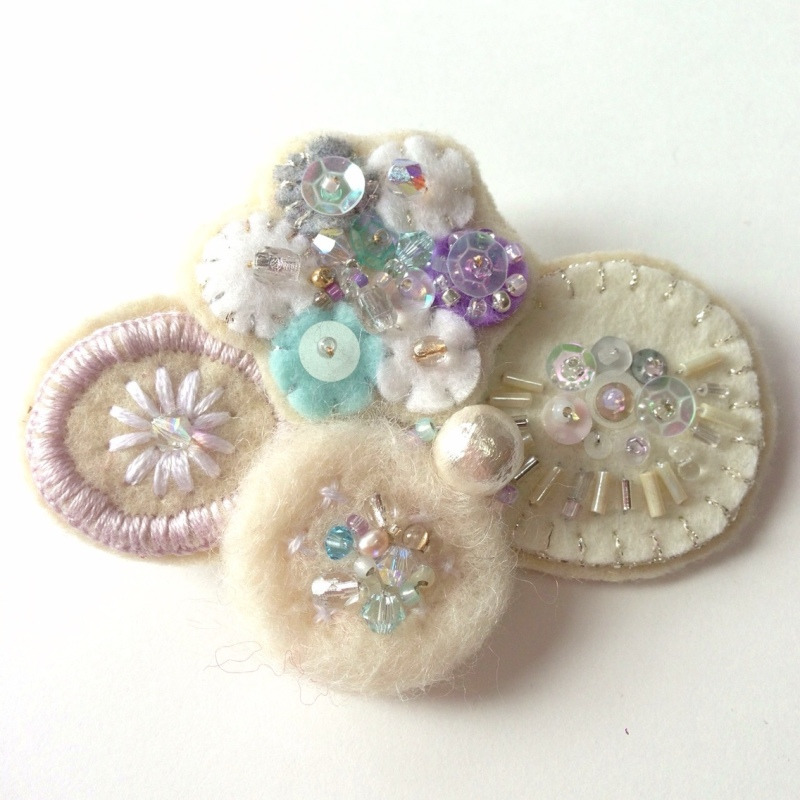 先ほどのものより少しだけあたたかみのある白に仕上げました。ふんわりとした羊毛フェルトに、光を抱えるビーズの組み合わせ。
