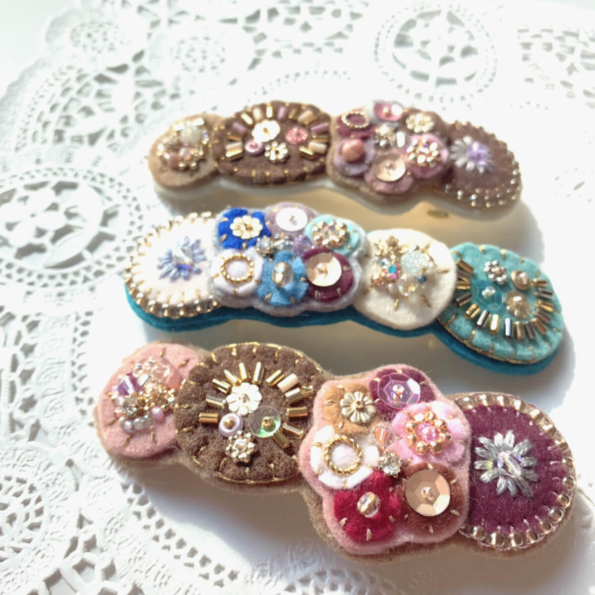 KAZARIのヘアバレッタも、いろいろな色合わせでご用意しました。