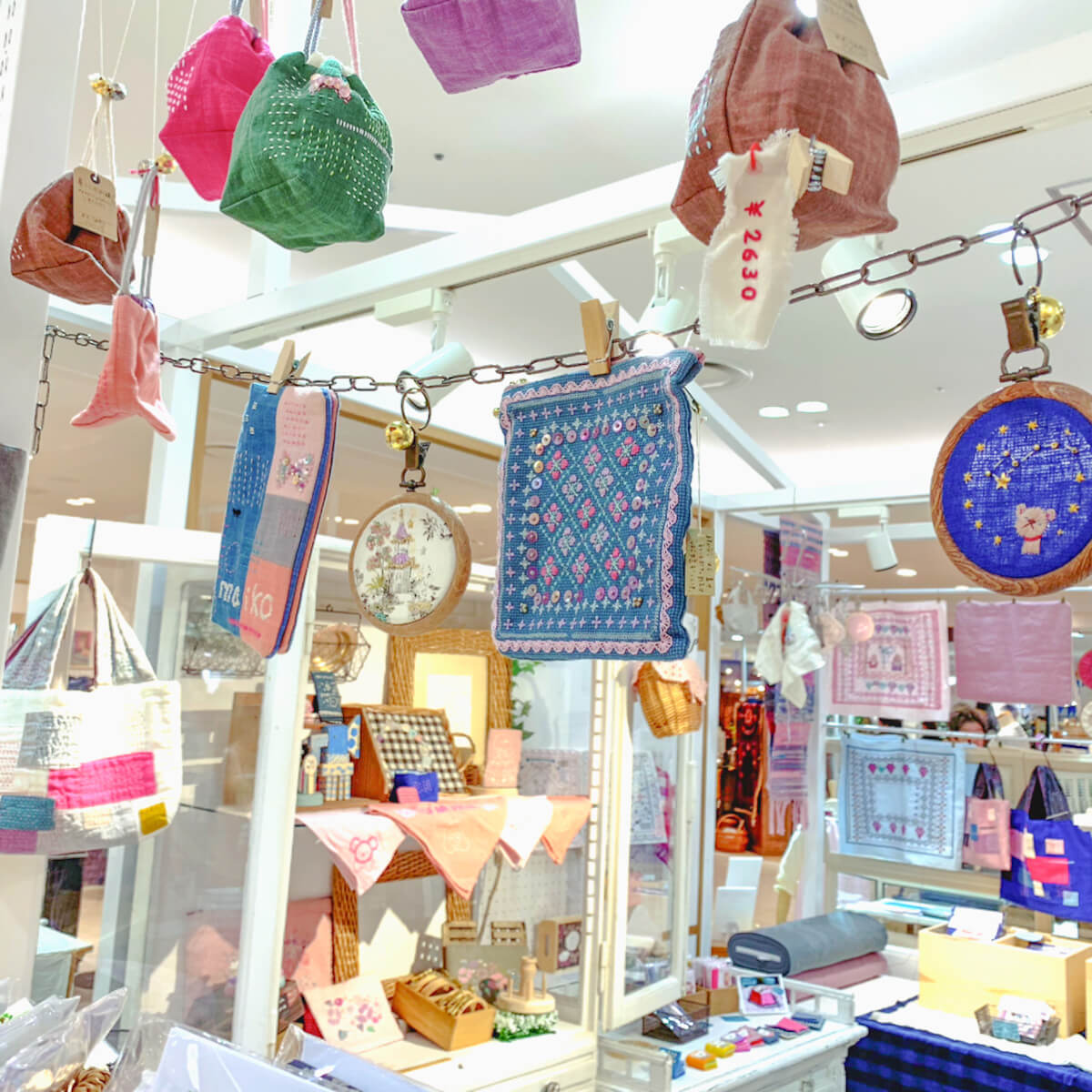 阪急うめだ本店の手芸売場「セッセ」さんでの出店。セッセクリエーターズアトリエというコーナーのこの白い什器がとてもお気に入りで、いろいろなアイテムを吊るすことで立体的な展示ができました。作品がよりいきいきと見える、素敵な空間でした。現在は全館で改装中。完成したらどんなことになっているかな…! とても楽しみにしています。