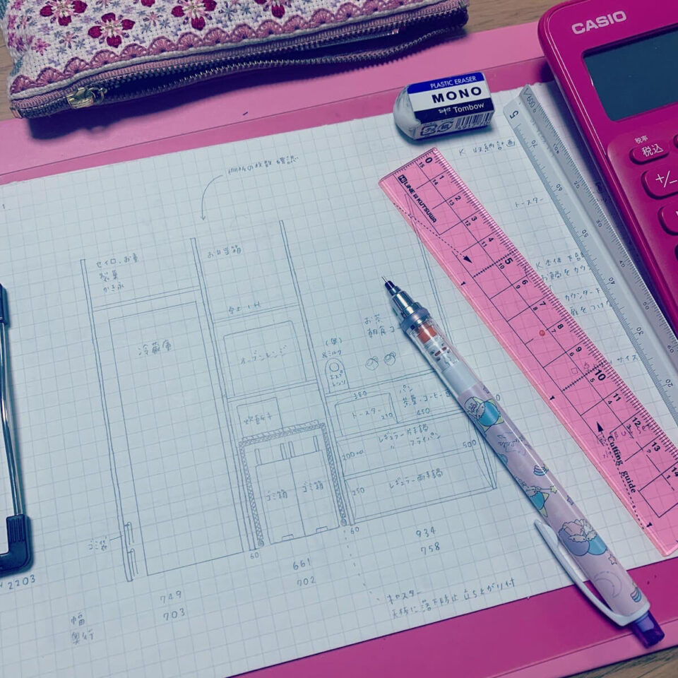 元々あった収納の壁の寸法を図り、どこにどんなものを置きたいかなどを考えてメモに起こします。