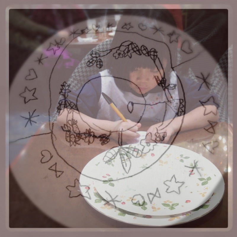 ワッフルを食べた後、お皿に描かれた野いちごの絵をコースターに描くスミレ。
